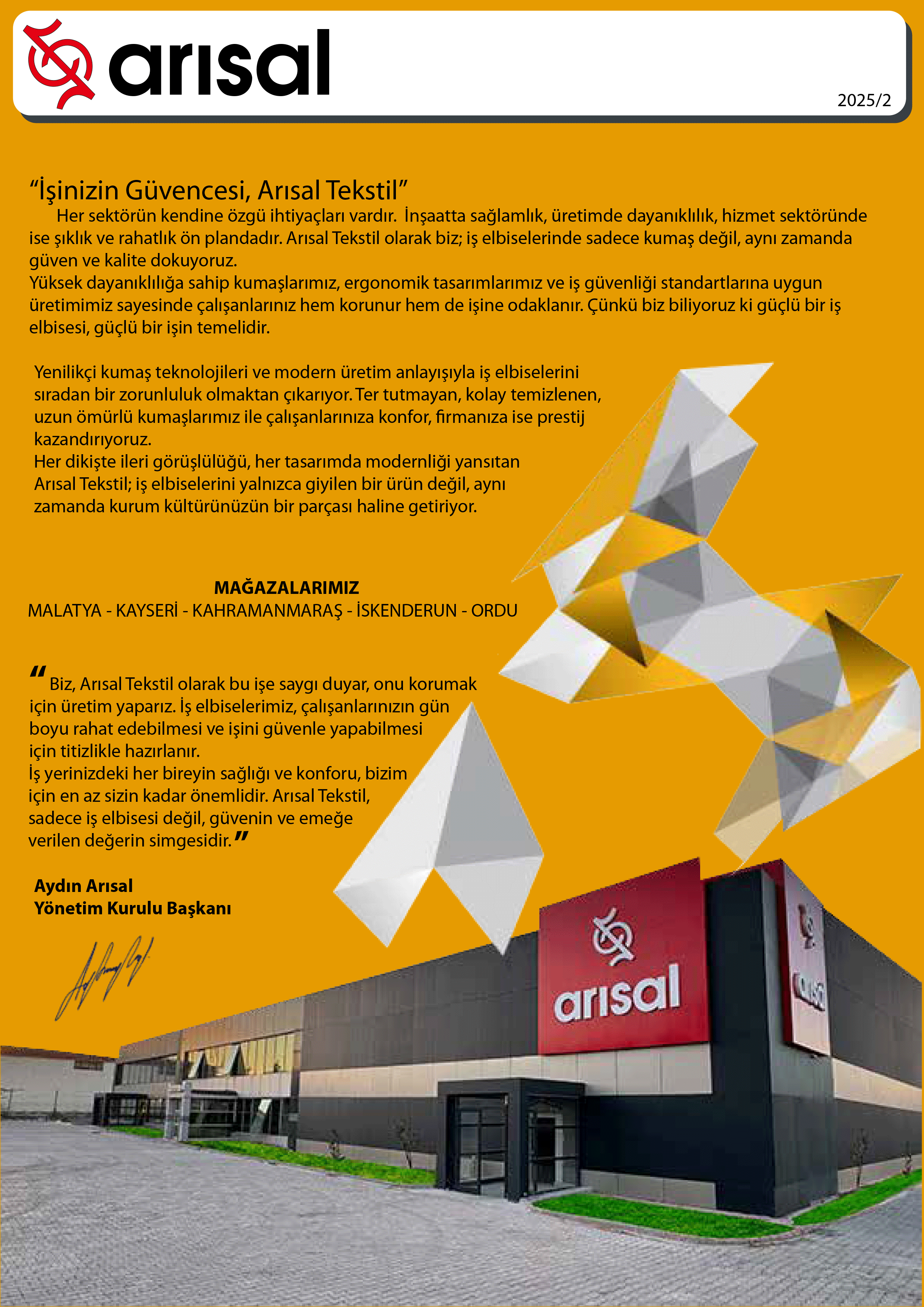 Arısal Tekstil’in Kısa Hikâyesi 1993 yılında pamuk, iplik ve kumaş (dokuma–örgü) alanında iş hayatına başlayan Arısal Tekstil, “İş’te güvenliğiniz için buradayız” mottosuyla Malatya iş elbiseleri üretimi ve iş ekipmanları satışını faaliyetlerine ekleyerek büyümeye devam etmektedir. Sektördeki gelişmeleri yakından takip ediyor; iş sağlığı ve güvenliğini ön planda tutarak, yüksek kalitede ve uygun fiyatlı ürünlerimizi zamanında sunuyoruz. Malatya’daki üretim ve satışımızın yanında Kahramanmaraş ve Kayseri ile birlikte toplam 3 mağaza ile hizmet veriyoruz. 2019’dan beri e-ticaret operasyonlarımızla satış ağımızı tüm Türkiye’ye genişlettik; müşteri memnuniyeti, çevre ve insan sağlığı odaklı yaklaşımımızla ürün çeşitliliği ve hizmet kalitemizi artırmayı sürdürüyoruz.